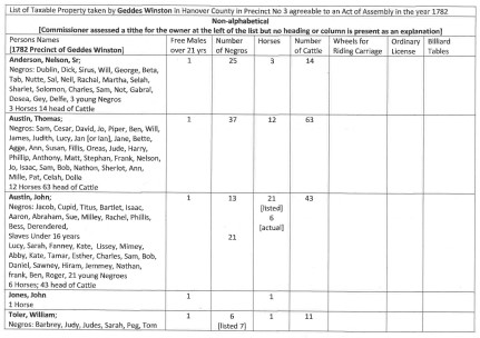 Information recorded in Virginia personal property tax records provide a wealth of information regarding the social status of an individual. The early laws required the tax commissioner in each district to record in "a fair alphabetical list" the names of the person chargeable with the tax, the names of white male tithables over the age of twenty-one, the number of white male tithables between ages sixteen and twenty-one, the number of slaves both above and below age sixteen, various types of animals such as horses and cattle, carriage wheels, ordinary licenses, and even billiard tables. Free Negroes are listed by name and often denoted in the list as "free" or "FN." By the 1850s, the personal property tax records contained detailed descriptions of personal property owned.